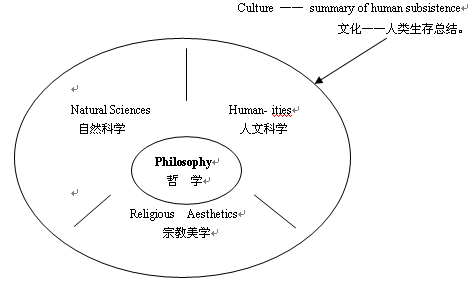 为了生存,人们在几千年的艰难困苦中总结了许多有形、无形的东西——文化。哲学位于文化的中心。如图:文化——人类生存的总结,哲学处于文化中心,哲学源于谋生。
